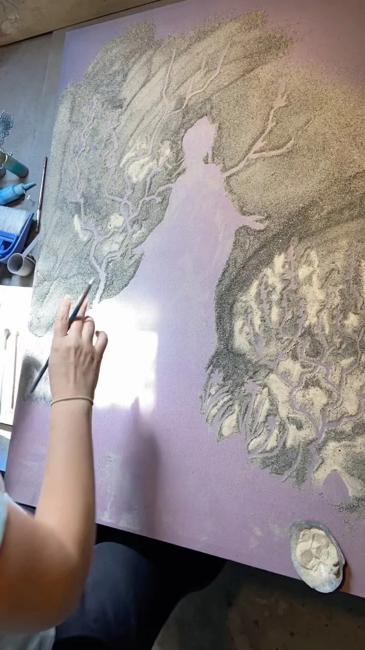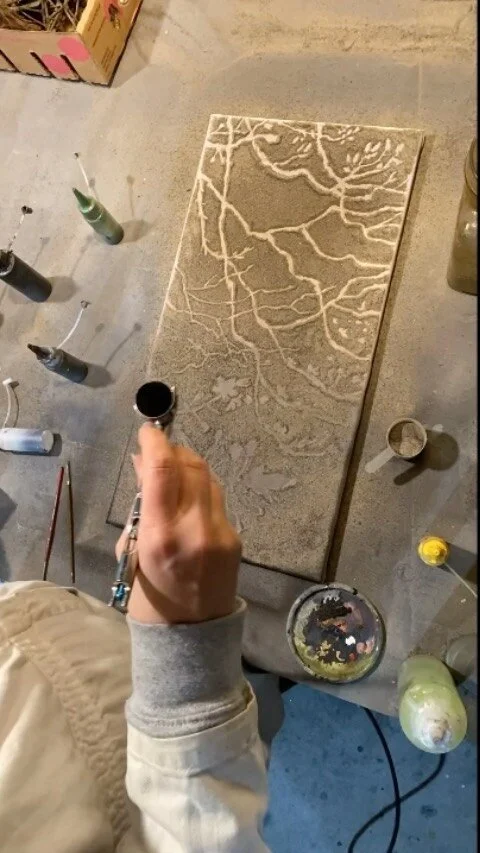 I’m a proud local artist, born in Kansas, and grew up on a small commune in the country. I started out in homeschool with a few other children and a teacher, who was and still is, an amazing artist that inspired me deeply. I dabbled in mediums and found a method using sand and spray paint on fabric, that I fell in love with. Building on that passion I built an art studio and learned to use the airbrush.